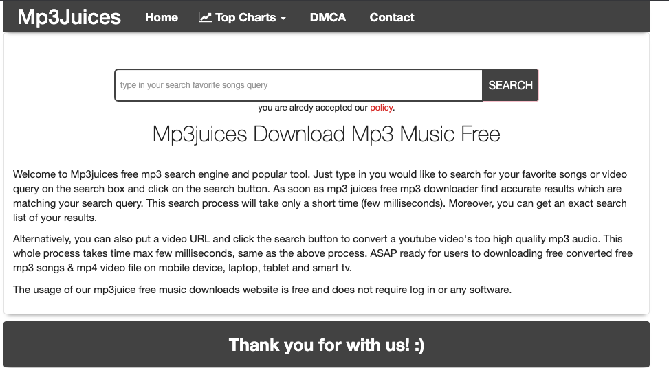 Mp3juices is an older website for downloading cost-free download music which is expanding day after day. When you open this website you will certainly have a menu bar with a lot of genres that you can pick from. You can likewise see one of the most popular songs as a grid on the homepage. It makes it very easy for you to download the mp3 quickly. You can likewise look for the song you? re looking for without any problem.